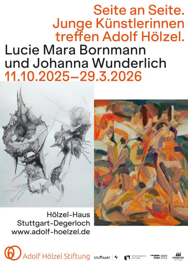 Im Andenken an Hölzels Damenmalklasse an der Staatlichen Akademie der Bildenden Künste Stuttgart erinnern wir an dessen progressive Haltung und seine offene Lehrweise. Auch in diesem Jahr laden wir zwei junge Studentinnen ein, ihre Arbeiten in einen Dialog mit dem Werk Adolf Hölzels zu stellen. Lucie Mara Bornmann und Johanna Wunderlich nähern sich auf individuelle Weise dem Medium der Malerei und Zeichnung und eröffnen mit ihren Werken frische Perspektiven auf Form, Farbe und Komposition. Ihre Positionen überraschen, fordern heraus und führen Hölzels Geist des Experiments weiter.